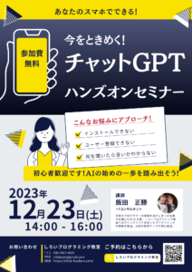 2023年12月4日 / 最終更新日時 : 2023年12月13日 cntsv お知らせ わくわくセミナー 今をときめくチャットGPTに登壇! 開催日時 2023年12月2日土曜日 場所 千葉県船橋市西部公民館 第1第2会議室 西部公民館主催 わくわくセミナー 講師 しろいプログラミング教室 飯田講師 \ 最新情報をチェック / FacebookXBlueskyHatenaCopy コメントを残す コメントをキャンセルメールアドレスが公開されることはありません。 ※ が付いている欄は必須項目ですコメント ※ 名前 ※ メール ※ サイト 次回のコメントで使用するためブラウザーに自分の名前、メールアドレス、サイトを保存する。